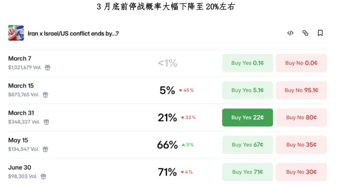 以上讨论聚焦于当下,那么,未来怎么看?值得注意的是,中东局势变幻莫测,市场预期一直在变化。从目前Polymarket等博彩网站的定价看,市场逐步认识到美伊冲突正在拖进持久战——资金预测3月31日前美伊停战概率降至20%,长胜证券,长胜证券配资,香港长胜证券公司5月中旬前停战的概率也仅60%左右。